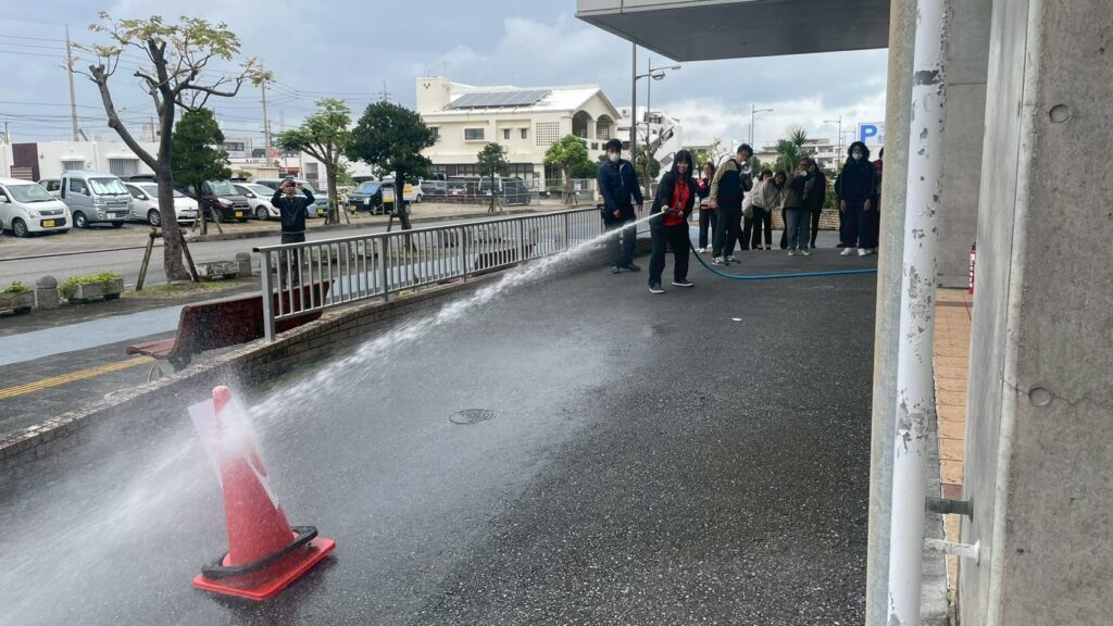 その後、2階フロアにある“垂直式 避難袋”の避難器具体験や、“水消火器”と“消火栓”を使用した消火訓練などを実施。